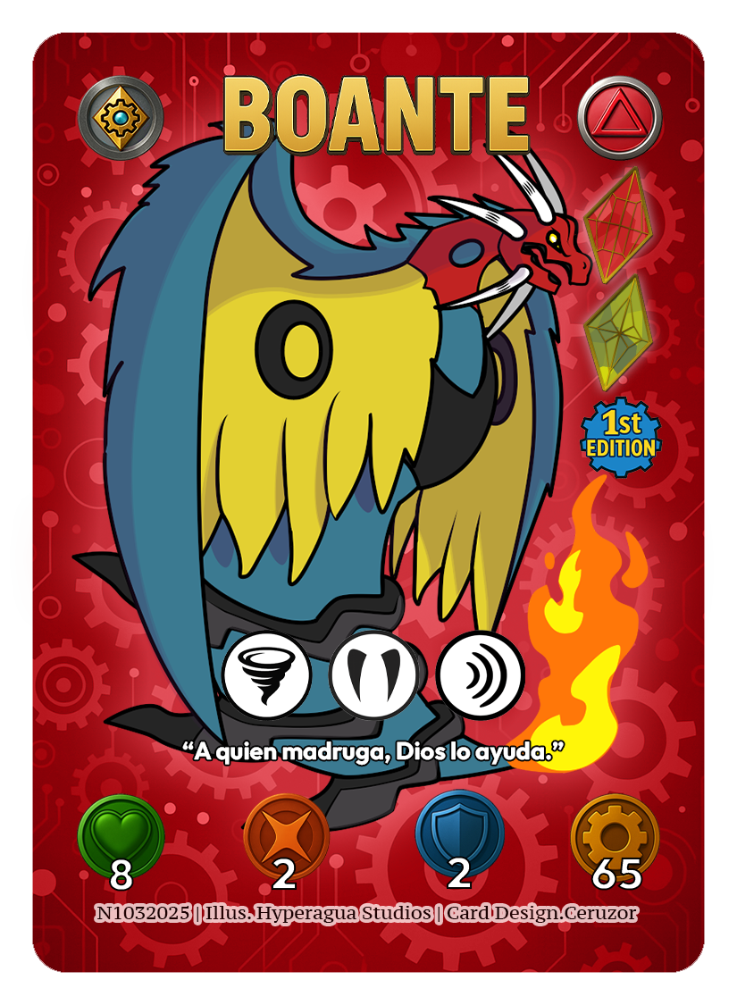 Boante’s bold patterns reseembles Vejigante Masks, emphasizing fiery illusions and rapid strikes to confuse foes.